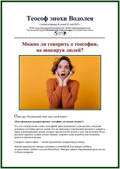 Теософ эпохи Водолея, май 2023 Ежемесячный журнал Независимой ложи теософов Читайте майский номер за 2023 год журнала “Теософ эпохи Водолея” 000 Приглашаем на сайт www.RussianTheosophist.com. 000
